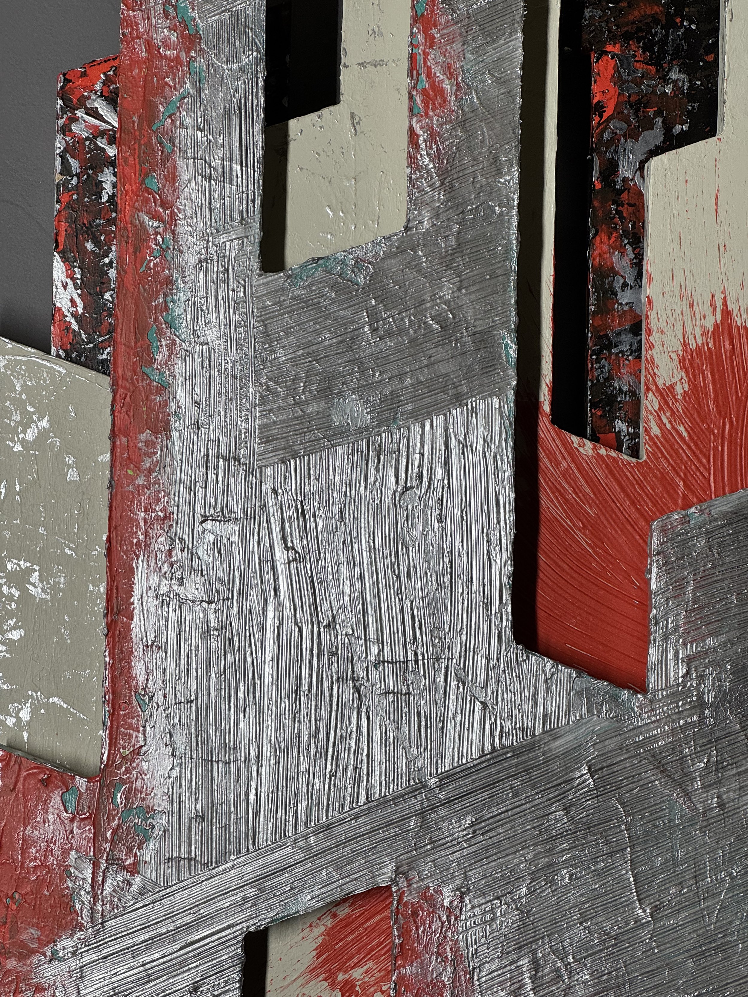 Lost and Found emerges as a complex interplay of form and surface, where sharp geometric fragments converge in a layered, three-dimensional structure. The composition builds outward with jagged, interlocking planes that challenge traditional boundaries between depth and flatness. Metallic silver surfaces catch and scatter light, while patches of vivid red punctuate the piece, creating tension and movement. Strategically placed off-white and silver accents provide moments of calm contrast, grounding the vibrant energy within the work.